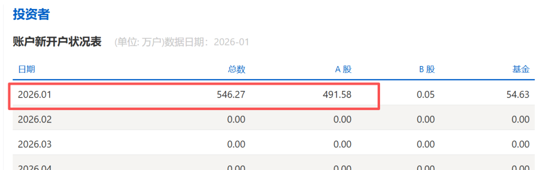 2月3日,上交所官网发布的数据显现,2026年1月A股新开户491.58万户,比客岁12月的259.67万户增长89%,比2025年1月的157.0万户增长213%。